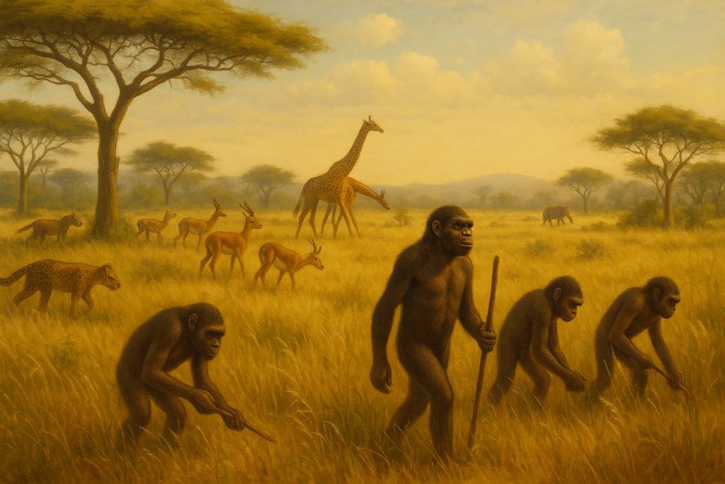Первые гоминиды начали чаще опускаться с деревьев, искать пищу на открытых пространствах, вставать на задние конечности, чтобы видеть дальше.