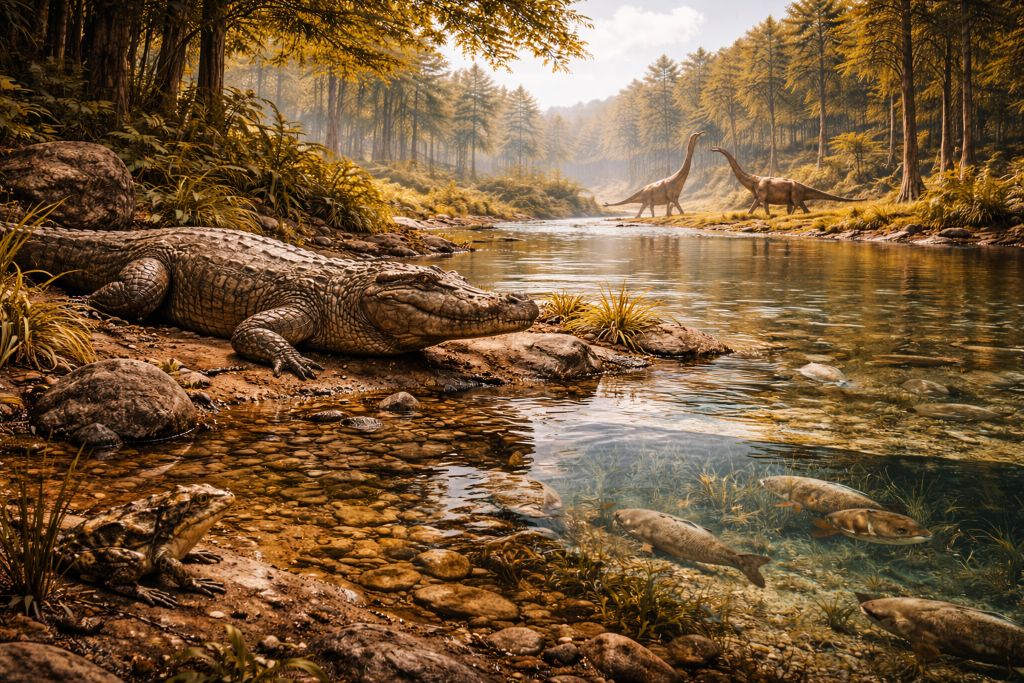 Юрский период (примерно 201–145 млн лет назад) часто представляют через океаны и гигантских динозавров, но пресноводные экосистемы были не менее важны. Реки, озёра, поймы и болота создавали “узлы жизни” на суше: здесь концентрировались вода, пища и укрытия, а значит — и большинство животных. Юрские пресные воды были мозаикой сред: быстрые русла, спокойные старицы, сезонные разливы, мелководные озёра и заболоченные участки. Это формировало богатые сообщества от рыб и амфибий до крокодиломорфов и динозавров, которые приходили пить, охотиться или размножаться.